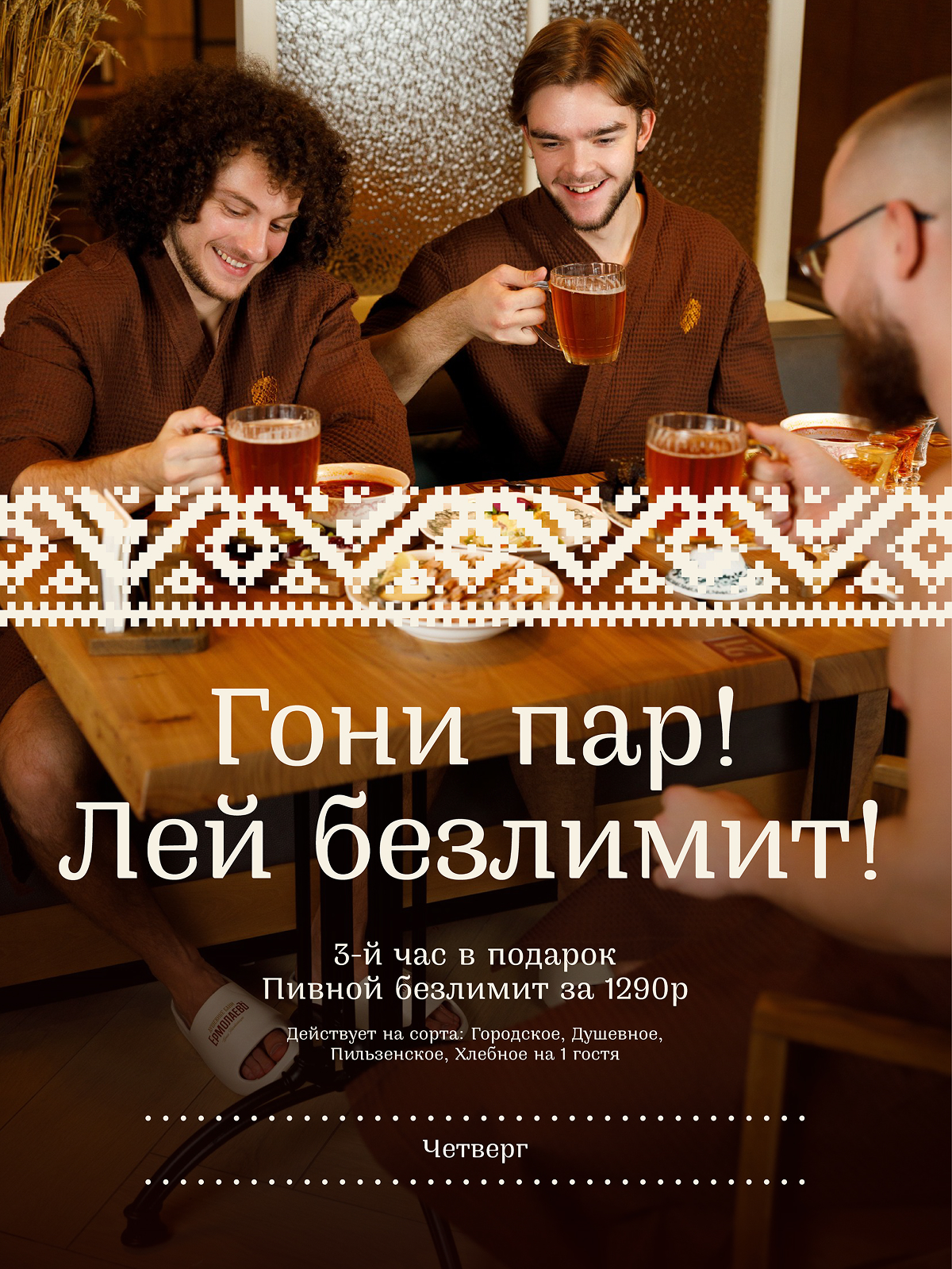 Весь день в душевных банях 3-й час посещения в подарок для всех действующих тарифов, а также пивной безлимит за 1290 руб.*